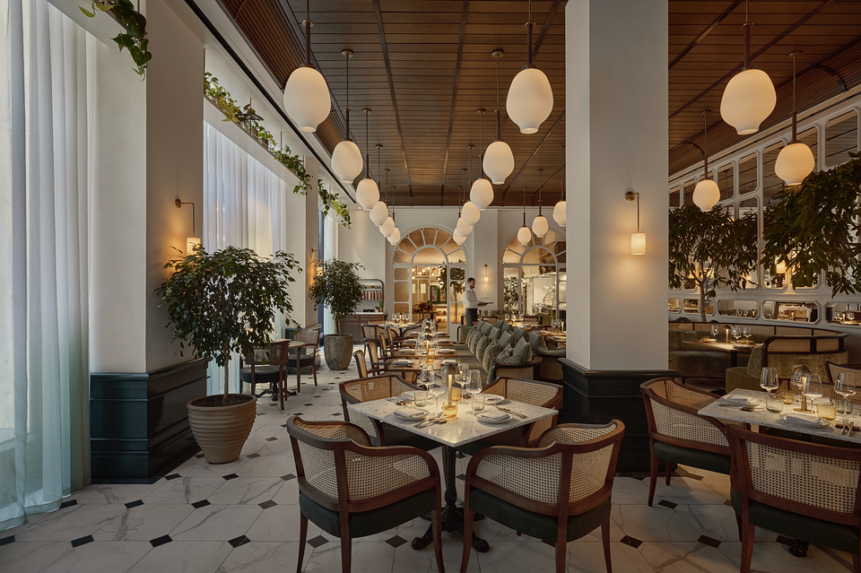 Los entornos, diseñados por AvroKO en colaboración con EPR Architects, preservan la fachada original catalogada como Grade II de The Whiteley, manteniendo su herencia Art Déco e inspirándose en la fascinación de William Whiteley por la Gran Exposición de 1851. Ese espíritu de encuentro entre industria e innovación bajo un mismo techo se refleja hoy en todo el hotel.